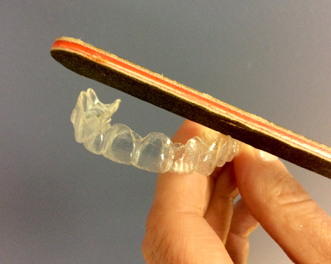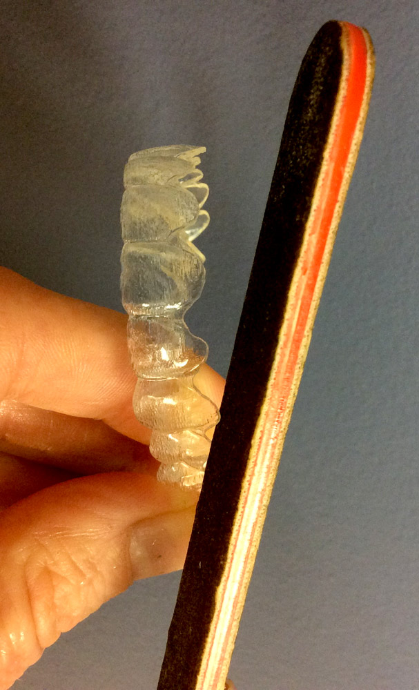Although the edge of the aligner at your gum line has been smoothed for your comfort, it can sometimes cause temporary irritation to the gums and lips. You can rub Orajel (enclosed) on the affected area. To smooth the rubbing surface of the aligner, you can use an emery board as shown in photo D and photo E. If the condition persists, contact Express Your Smile to arrange for an appointment with the doctor to check/smooth the edge.